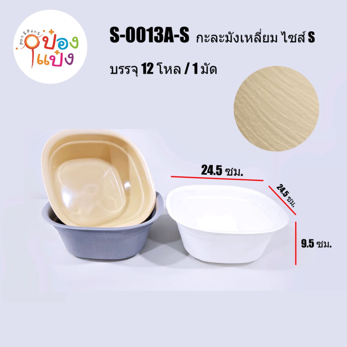 941. (A128-S013A-S) กะละมังเหลี่ยมขอบมน ไซส์ S ในพื้นเรียบนอกลายไม้ 24.5x24.5x10CM 1*144