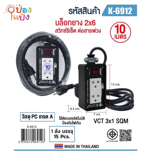 194. (B218-F-6912) บล็อคยาง 2x6 มีสวิตซ์รีเซ็ท 10เมตร 2ช่อง 3ขา 1*15 **318บาท/ชิ้น ขั้นต่ำ 3ชิ้น