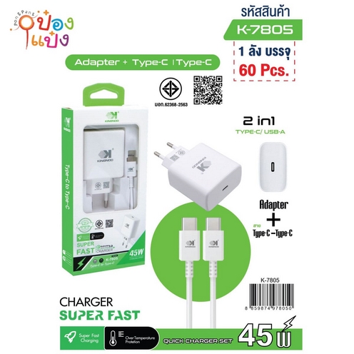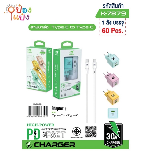 351. (B205-F-7805) เต้าเสียบ USB+สาย C-C หัวชาร์จครอบพลาสติกใส มี มอก คละสี 1*60 **62.5บาท/ชิ้น ขั้นต่ำ 6ชิ้น