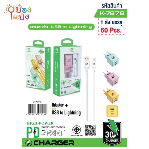 354. (B205-F-7878) เต้าเสียบ USB+สาย IP หัวชาร์จครอบพลาสติกใส มี มอก คละสี 1*60 **65บาท/ชิ้น ขั้นต่ำ 6ชิ้น