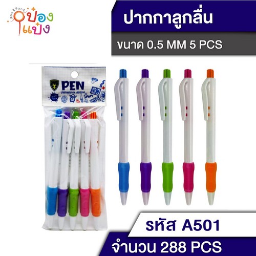 483. (B406-TL-A501) ปากกาลูกลื่น แพ็ค 1x5 ด้ามสีขาวตัวกดสี ปลอกคละสี 1*288
