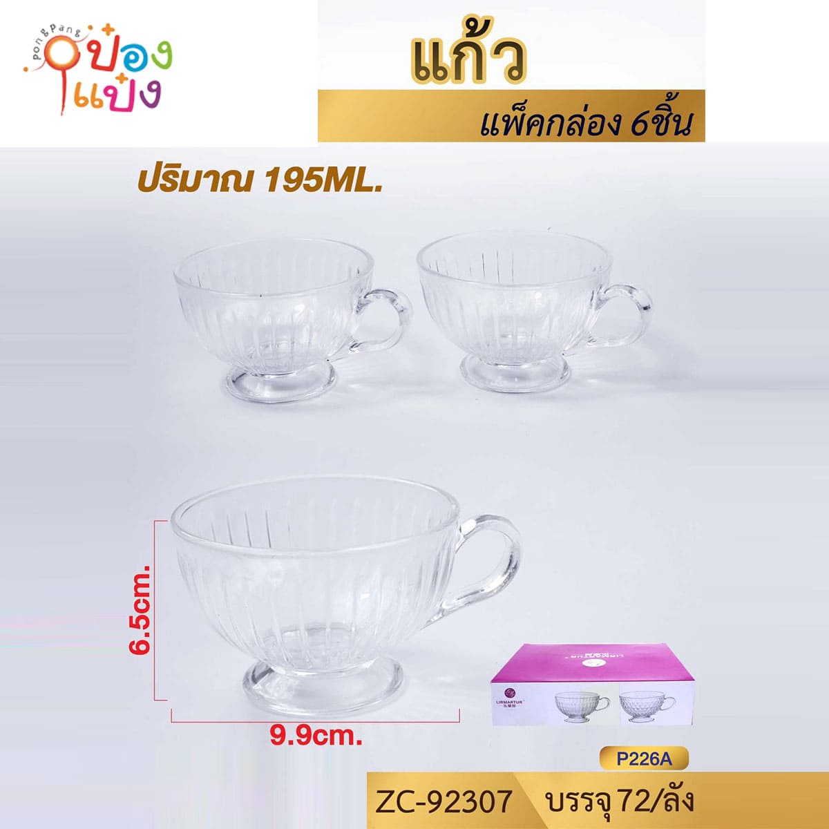 614. (A143-ZC92307) แก้วไอศกรีม ทรงเตี่ยมีหู 195ML 9.9x6.5CM ลายเส้นตรง 1*72