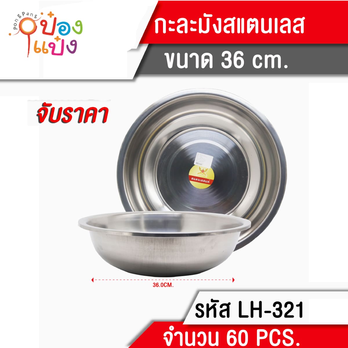 1088. (B209-LH321) กะละมังสแตนเลส 36CM. 40 บาท/ชิ้น ขั้นต่ำ 6 ชิ้น