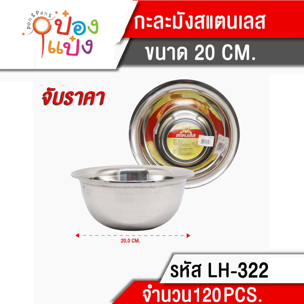 1074. (B209-LH6026-322) กะละมังสแตนเลส 20CM. แบบบาง 35 บาท/ชิ้น ขั้นต่ำ 6 ชิ้น T322