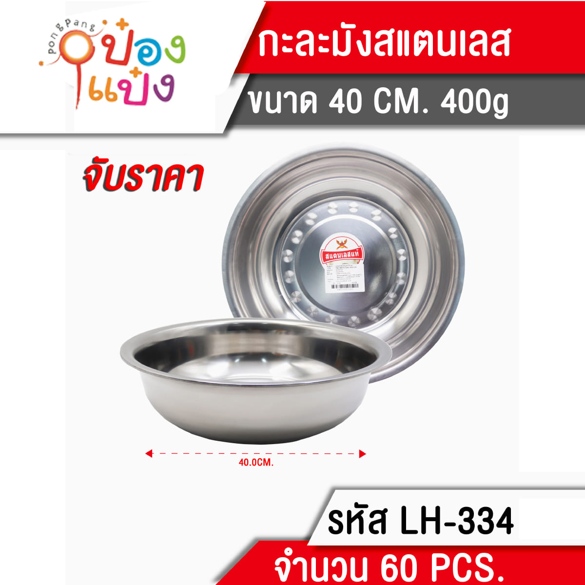 1090. (B209-LH6024-334) กะละมังสแตนเลส 40cm 400g 45 บาท/ชิ้น ขั้นต่ำ 6 ชิ้น