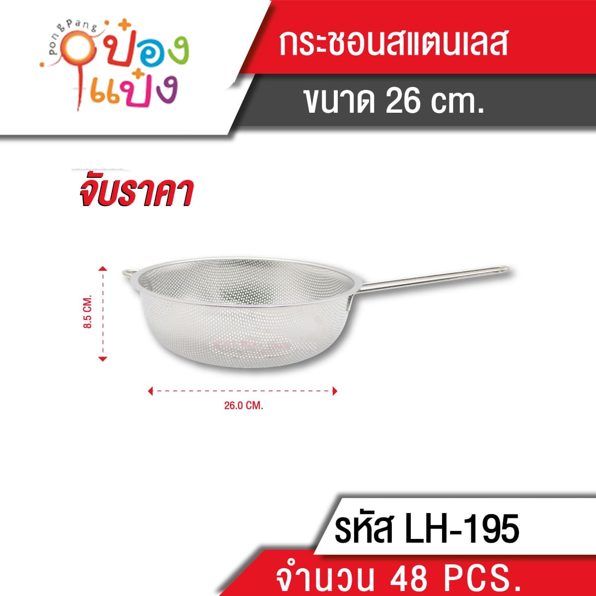 1006. (B209-LH7022-195) กระชอนสแตนเลส 26cm. ด้ามจับสแตนเลส 1*48 **72 บาท/ชิ้น ขั้นต่ำ 6 ชิ้น
