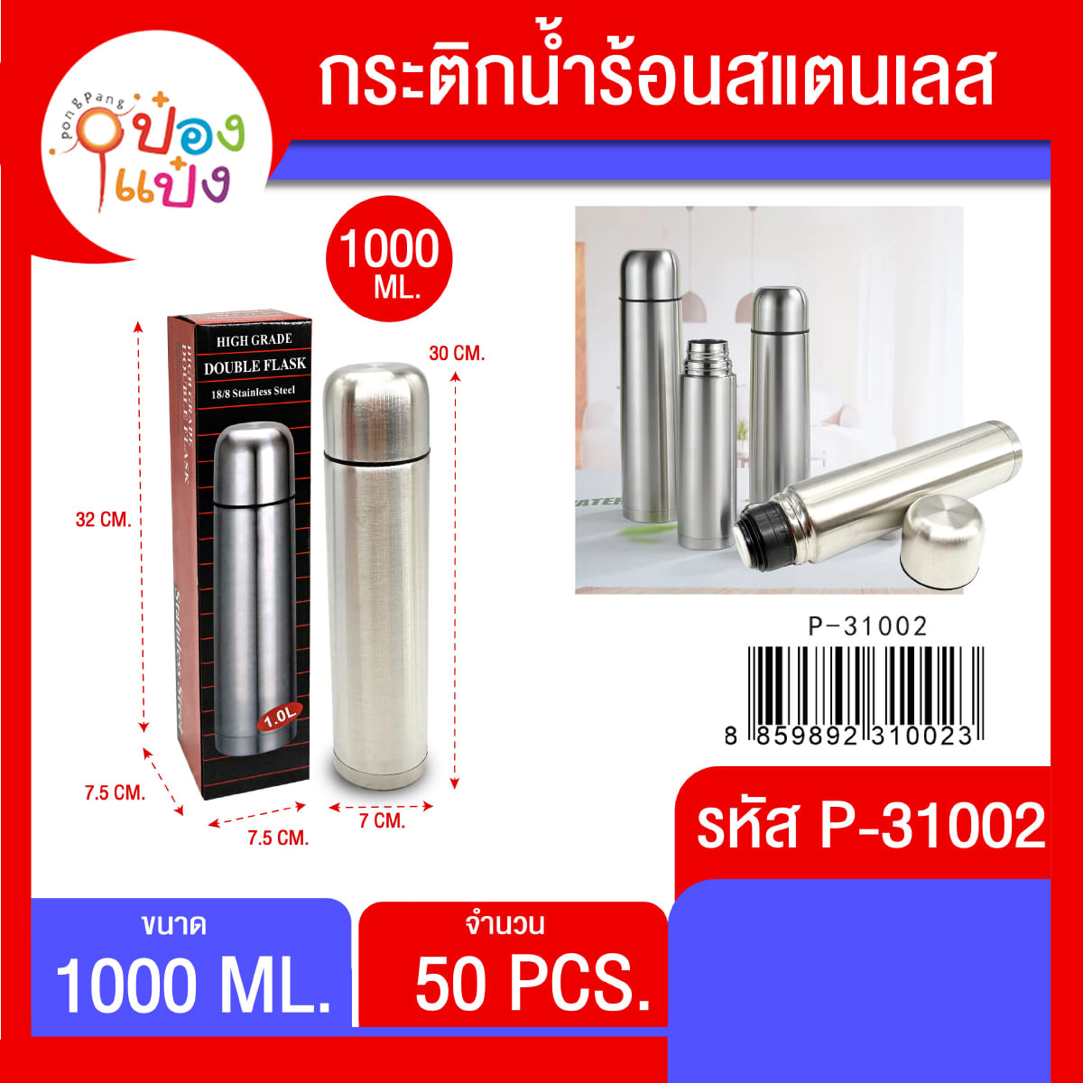 1007. (B209-LHP31002) กระติกน้ำร้อนสแตนเลส 1000ml สีเงิน HIGH GRADE DOUBLE FLASK 1*50
