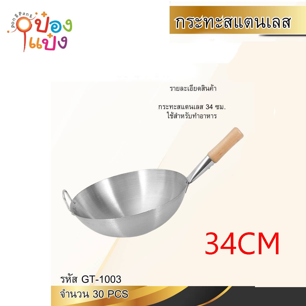 1018. (B224-GT-1004) กระทะสแตนเลส 36CM มีหูด้ามจับไม้ 1*30 **125บาท/ชิ้น ขั้นต่ำ 3ชิ้น