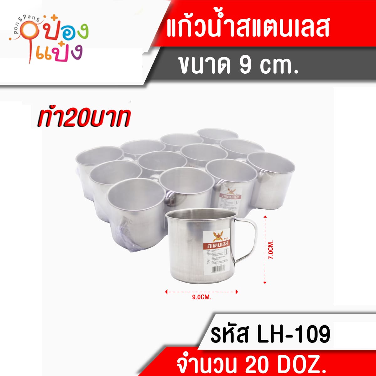 1370. (A291-LH7501-109) แก้วน้ำมีหูสแตนเลส 9cm. 1*240 P88-0025A สินค้า 10บาท T109