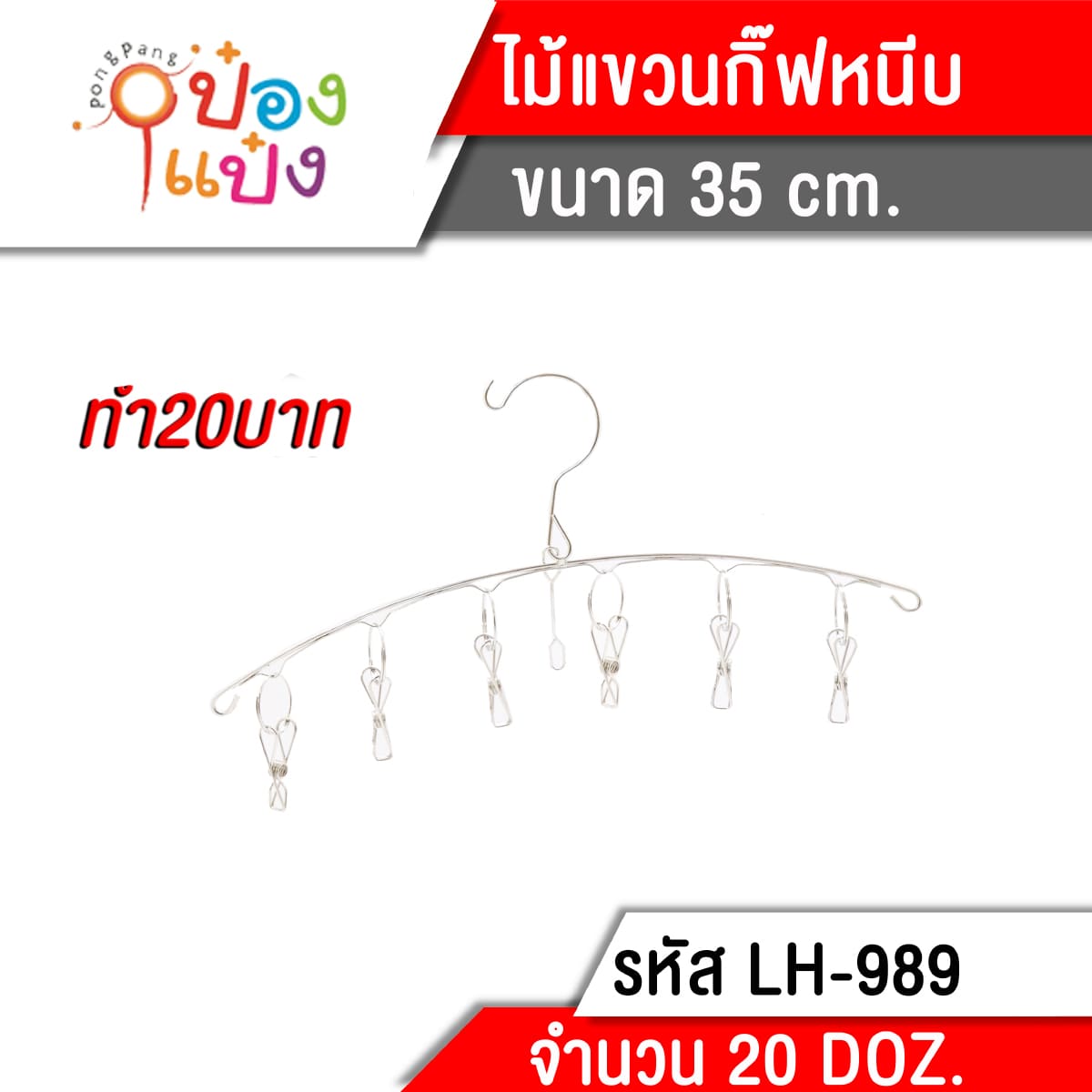 1376. (A291-LH8109-989) ไม้แขวนเสื้อ สแตนเลส กิ๊บหนีบ 6 ตัว 35 cm. (1*240) T989