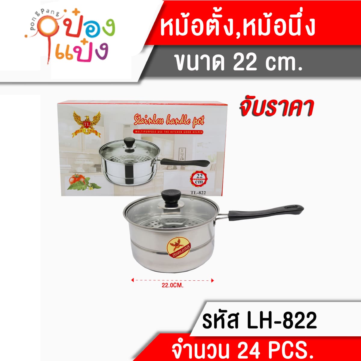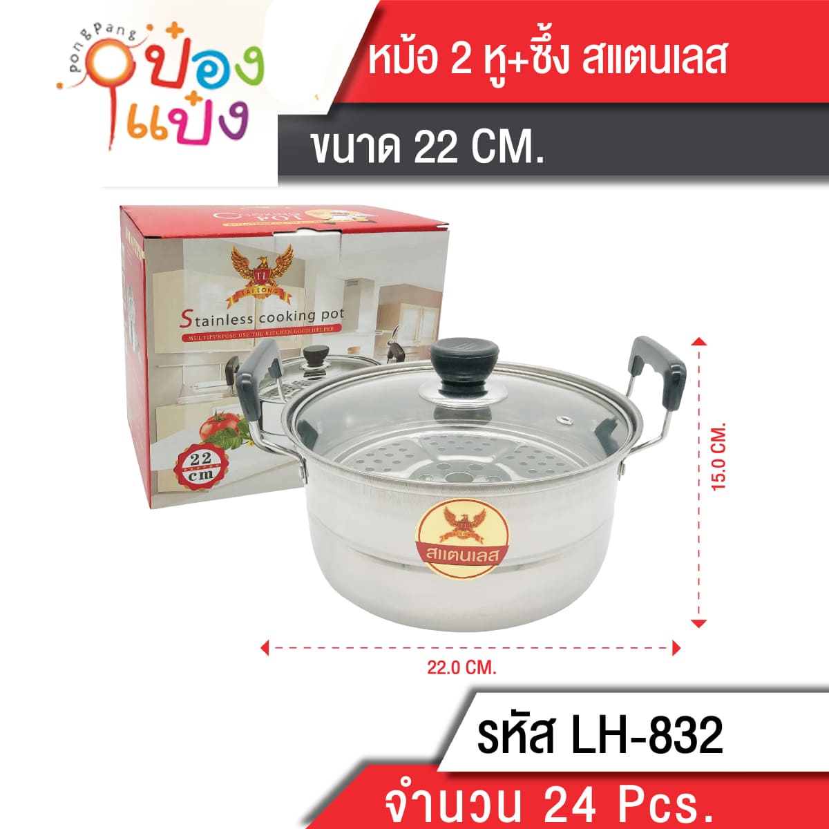 1335. (B209-LH6300-832) หม้อ2หู หม้อนึ่งฝาแก้ว 22cm **90 บาท/ชิ้น ขั้นต่ำ 3 ชิ้น TP-K70