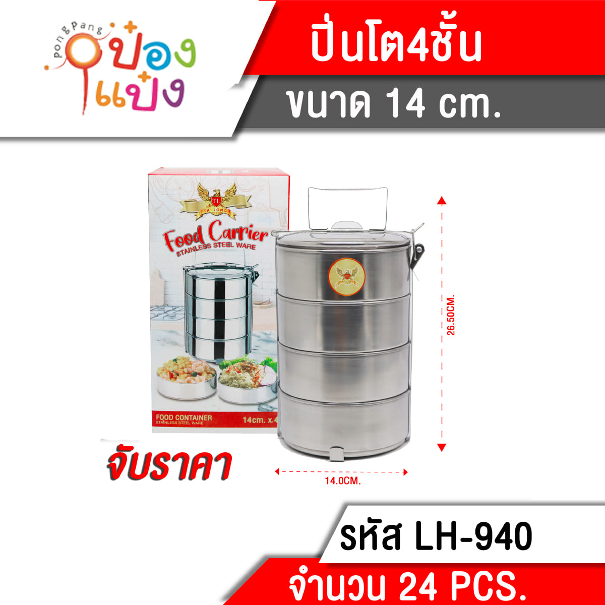 1315. (B209-LH8040-940) ปิ่นโตกลมสแตนเลส4ชั้น 14cmx4 1*12 **80บาท/ชิ้น ขั้นต่ำ 3 ชิ้น T940