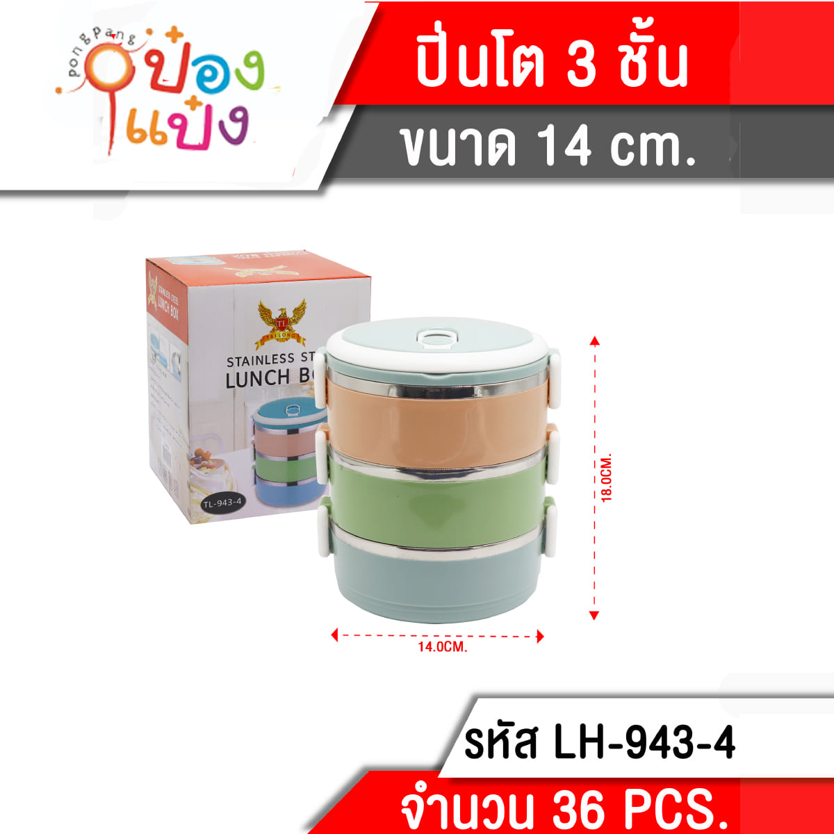 1314. (B209-LH8039-943) ปิ่นโตกลมสแตนเลส3ชั้น 14cmx3 1*12 FC605-3 ปิ่นโต3ชั้น **65 บาท/ชิ้น ขั้นต่ำ 6 ชิ้น T943