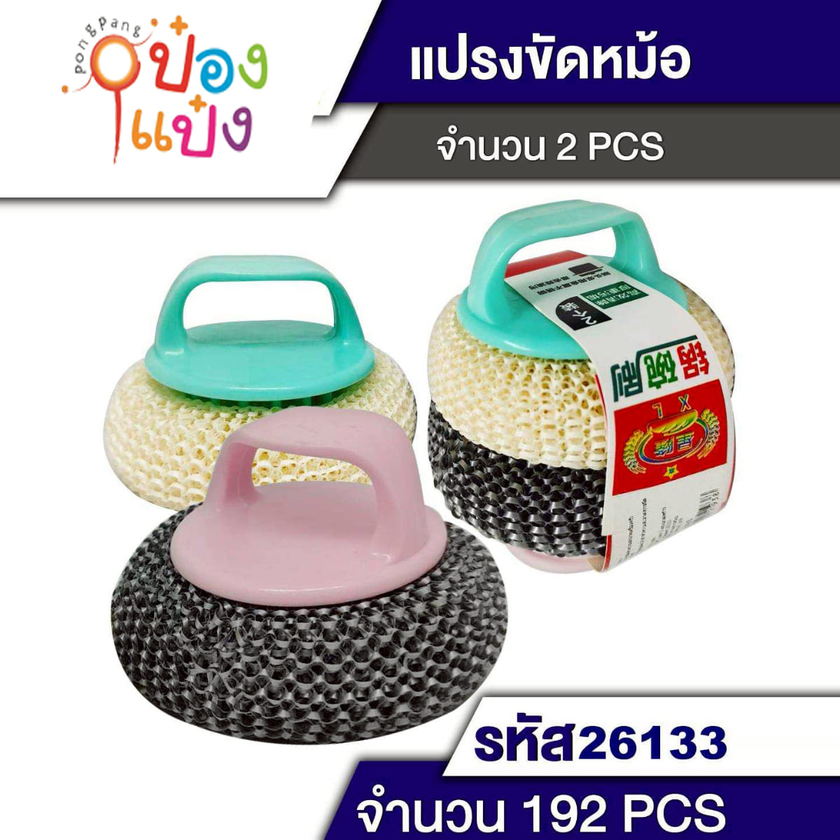 604. (B348-T26133) ฝอยขัดกระทะ ด้ามจับโค้งสั้น คละสี แพ็คเดี่ยว 1*192 W805