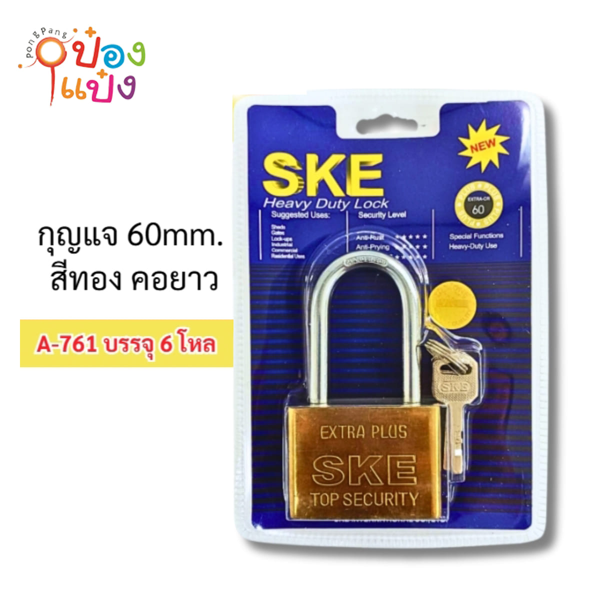 536. (B229-S761) แม่กุญแจเงินคอยาว สีทอง 60MM เหลี่ยม+โค้ง อย่างดีแผงน้ำเงิน 1*72 **38บาท/ชิ้น ขั้นต่ำ 6ชิ้น
