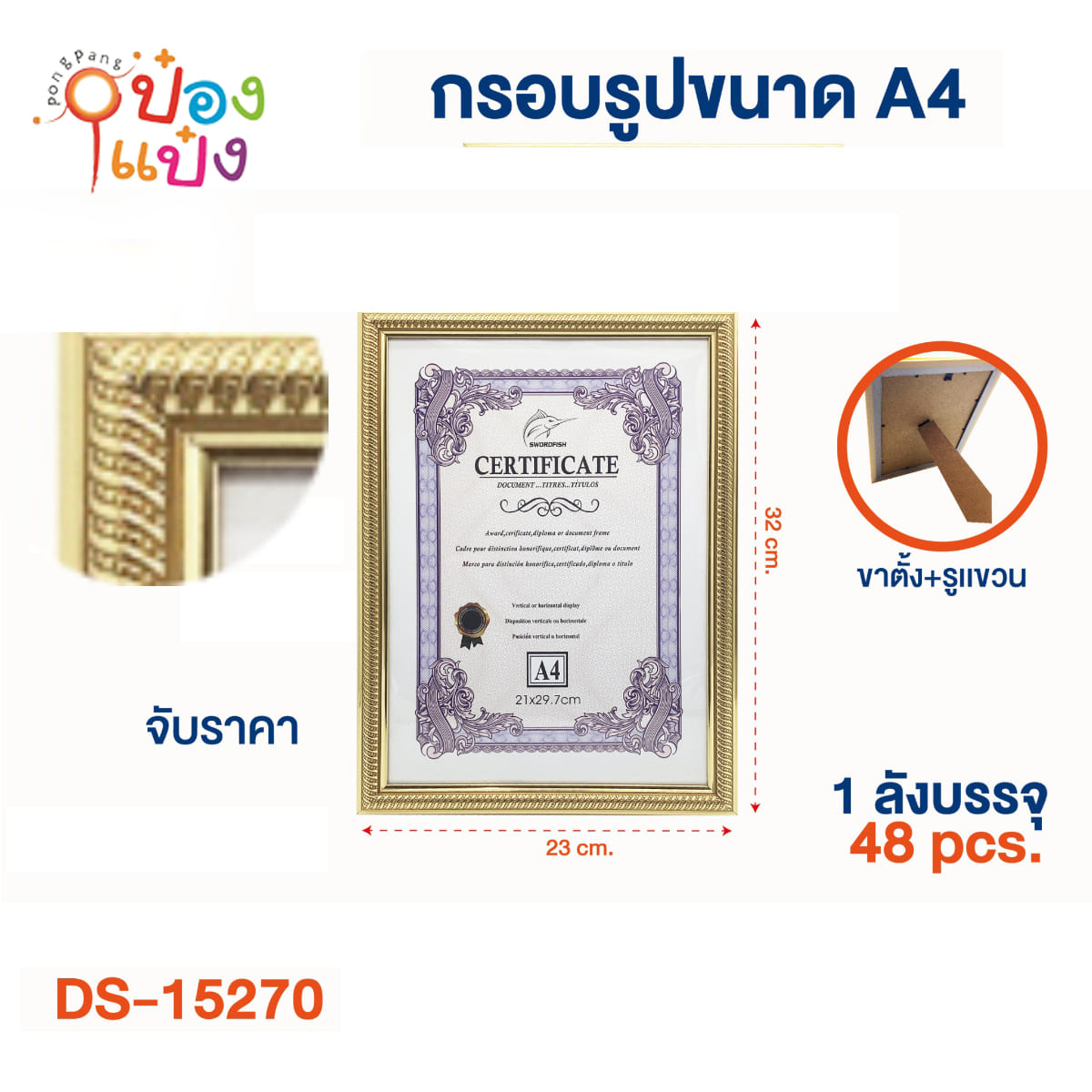 24. (B210-HD15270) กรอบรูป A4 ขอบทอง 23x32CM เส้นเกลียวใหญ่ ขาตั้ง ** 30บาท/ชิ้น ขั้นต่ำ 12ชิ้น