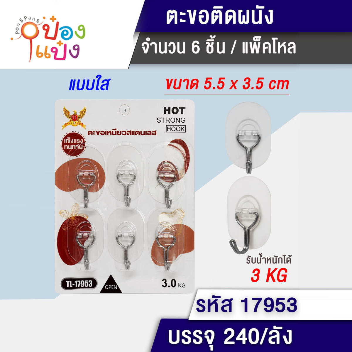 608. (B359-LG5566) ตะขอติดผนัง ไม่ต้องเจาะ สีใส 1x6