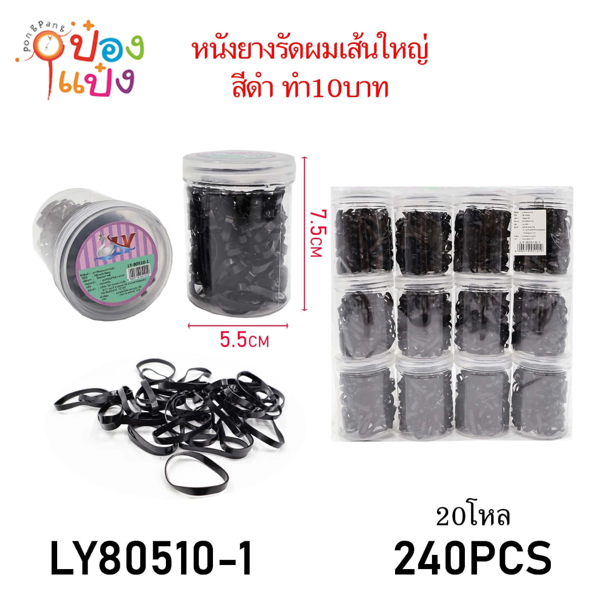 511. (A256-LY80510-1) ยางรัดผมเส้นใหญ่ สีดำ แบบกระปุกกลมใส 1*240 สินค้า 10บาท