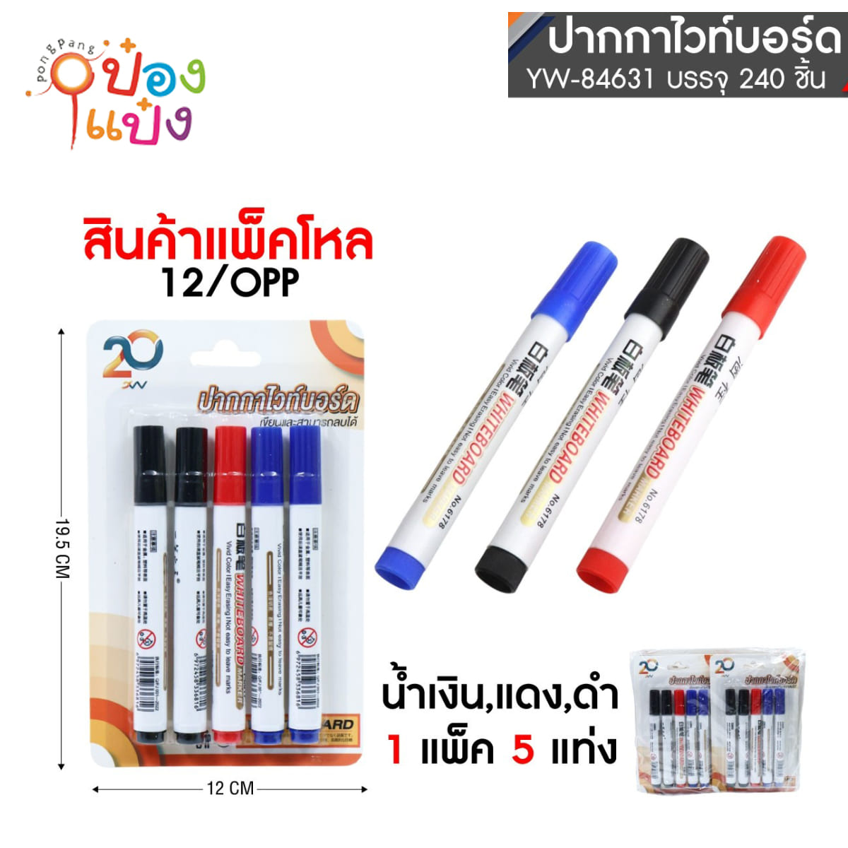 590. (B420-YW84631) ปากกาไวท์บอร์ด 1x5ชิ้น ดำ2+แดง1+น้ำงิน2 1*240
